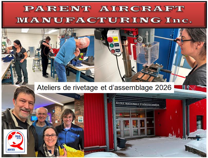 Depuis 2007 Michel Parent / PARENT AIRCRAFT MANUFACTURING Inc. anime à travers l'organisation du RAA415, des cours de perfectionnement pour ceux qui s'intéresse à l'assemblage de leurs propres avions. À la date proposée ce sera le cours d'assemblage avancé ou l’atelier de rivetage. Ces cours ne sont pas à leur première présentation et sont très bien rodés. Michel Parent a formé depuis 2007 plus de 204 personnes venant des quatre coins du Québec. Ces cours font en sorte que les avions sont de meilleure qualité, et par la suite plus sécuritaires. Ayant suivi de la formation les installateurs/monteurs assemblent des avions qui ont une meilleure valeur de revente. Les cours ont lieu un samedi en février dans un local adapté de l'École Nationale d'Aérotechnique. Si vous êtes intéressé à suivre ce/ces cours, je vous invite à envoyer un message dans la section : Nous contacter ou un E-mail à : info@parentaircraftmfg.com pour recevoir le plan de cours proposé et c'est sans obligations subséquentes. Vous pouvez aussi consulter le plan de cours du/des cours proposés, en attachement juste ici en dessous. Au plaisir de vous donner toute l'information dont vous avez besoin pour mener à terme votre construction.